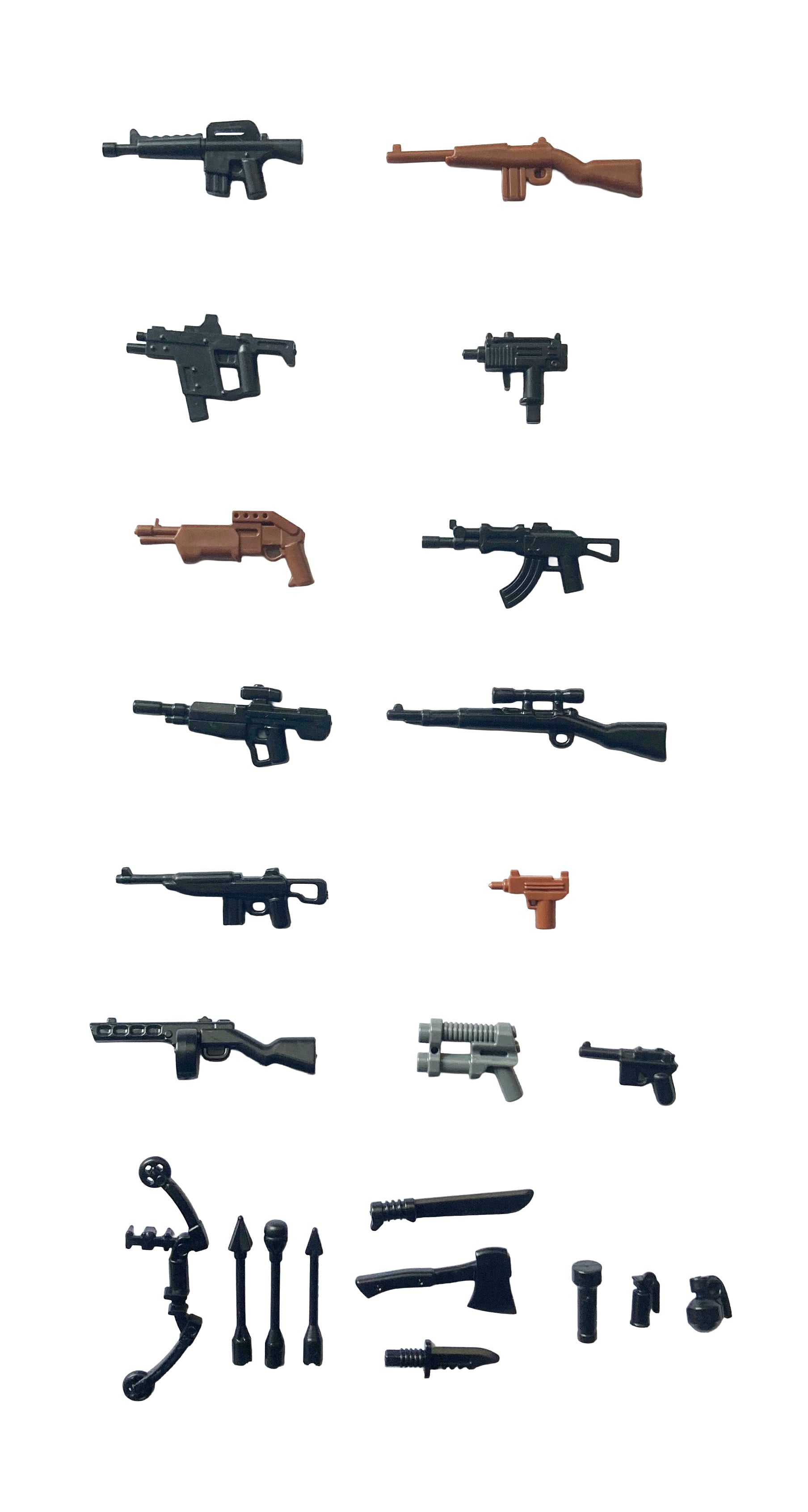 Pack includes 20 different weapons,rifles,submachine guns,pistols and accessories.