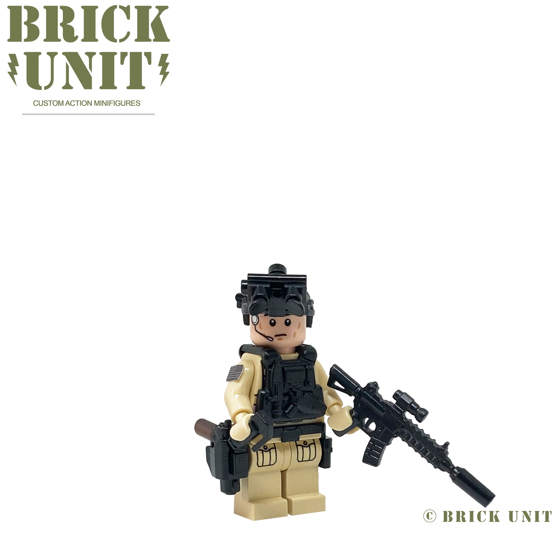1x custom printed minifigure with tactical helmet with night vision goggles,tactical vest,tactical belt,pistol,U.S. flag patch sticker,416 assault rifle with suppressor,flashbang grenade.